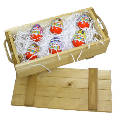 В составе деревянный ящик нашего производства, 6 киндер-сюрпризов, декор