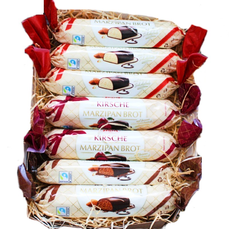 В составе: марципановая буханка с классическим вкусом - 3 шт. марципановая буханка со вкусом какао - 2 шт. марципановая буханка со вкусом вишни - 2 шт.