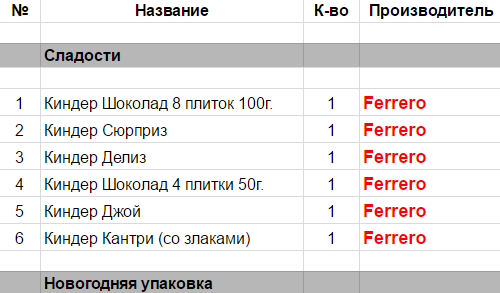 Киндер Сюрприз (1 шт), Киндер Шоколад 8 плиток 100г. (1 шт), Киндер Делис (1 шт), Киндер Шоколад 4 плиток 50г. (1 шт), Киндер Кантри (со злаками) (1 шт), Киндер Джой (1 шт)